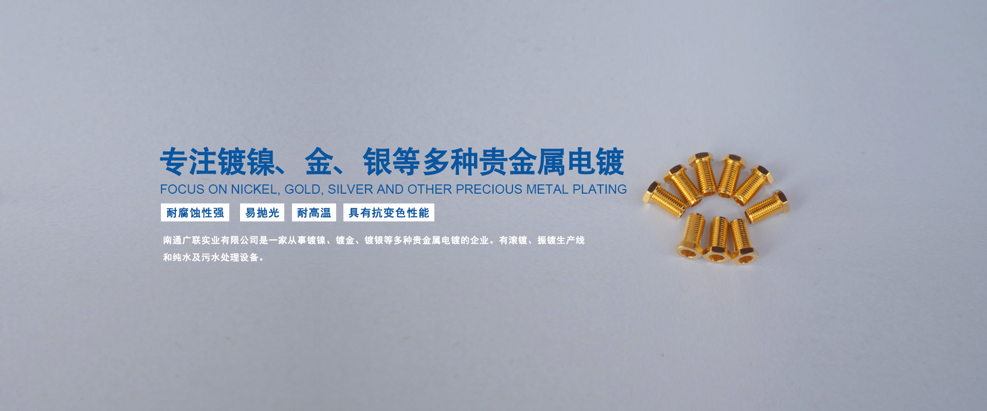 南通廣聯(lián)實業(yè)有限公司是一家從事鍍鎳、鍍金、鍍銀等多種貴金屬電鍍的企業(yè)。有滾鍍、振鍍生產線和純水及污水處理設備。